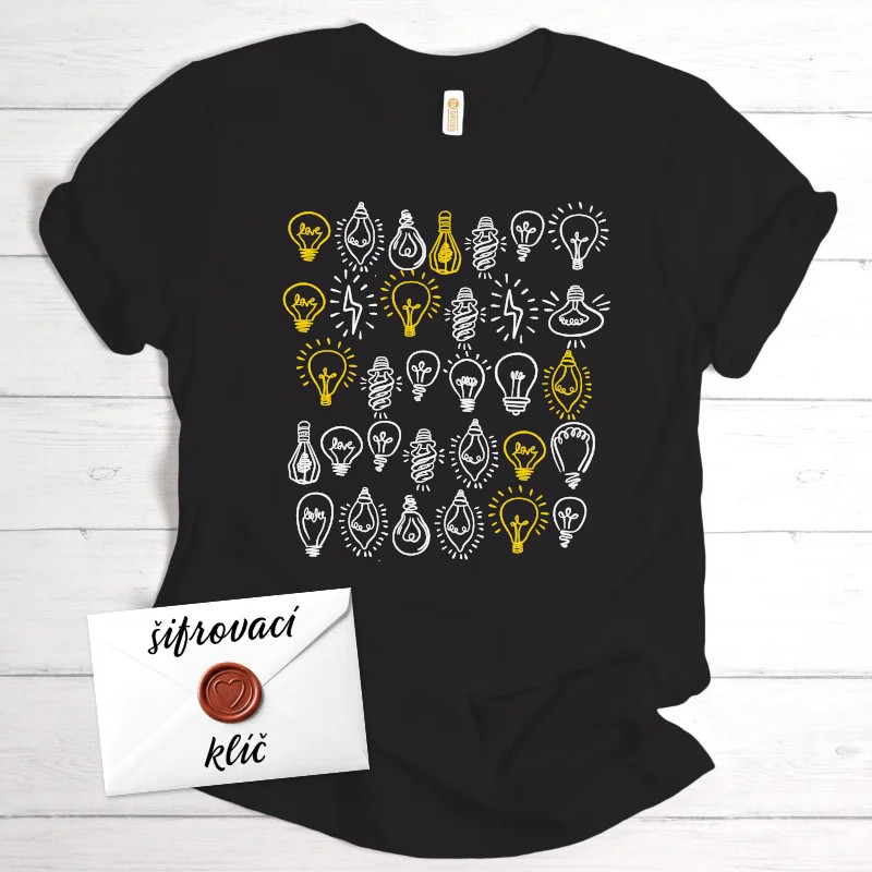 Tričko s originálním šifrovaným vzkazem z obrázků žárovek, symbolizujících nápady. Ideální dárek pro kreativce, snílky i ty, co hledají novou inspiraci.