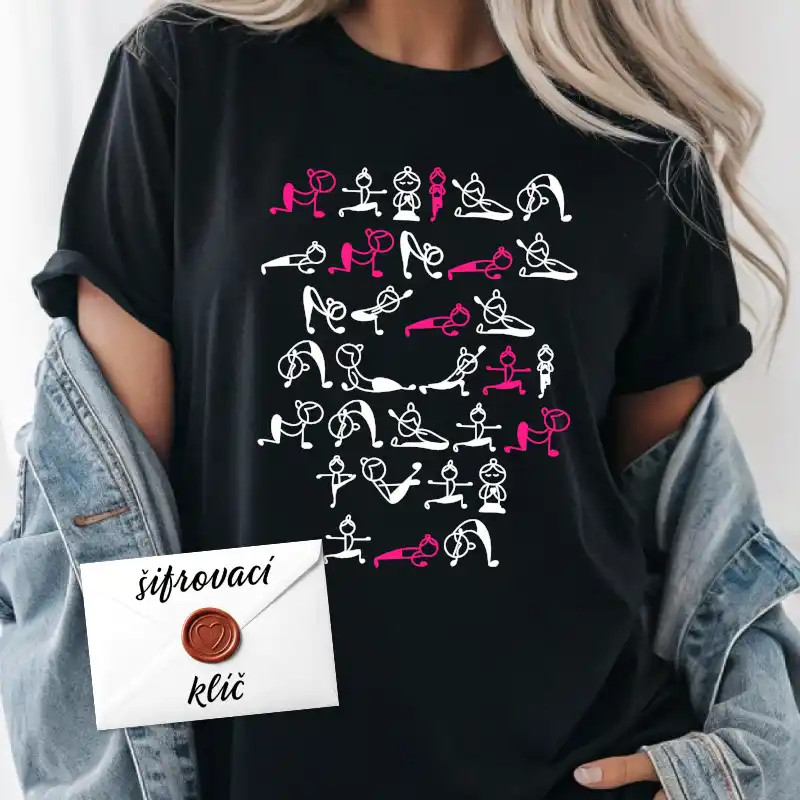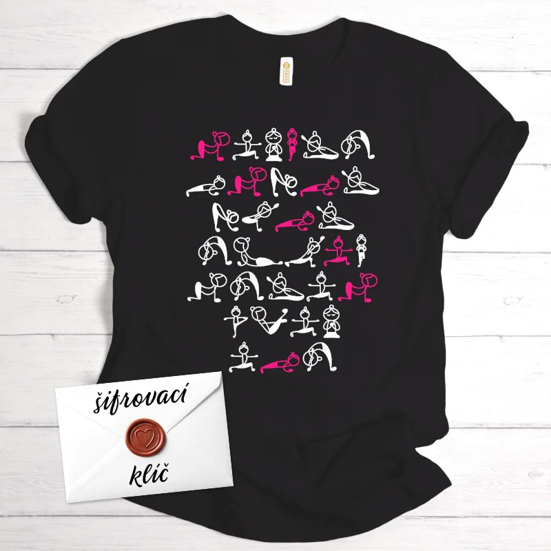 Originální tričko s tajně zašifrovaným vzkazem pomocí jógových pozic. Dokonalý dárek pro ženy a milovnice jógy – včetně šifrovací tabulky k rozluštění!