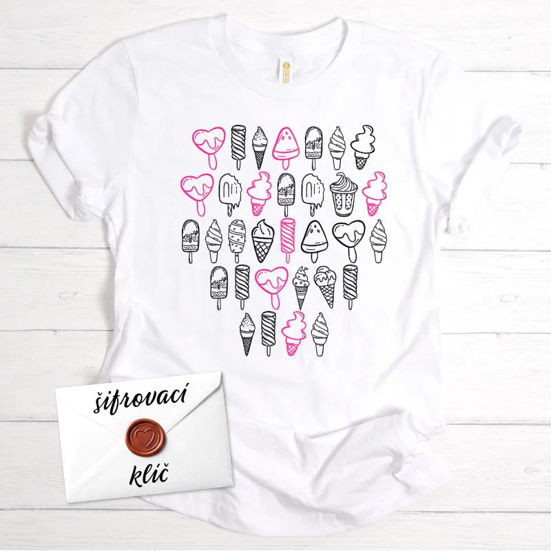 Tričko Šifrovaný vzkaz – Zmrzlina spojuje hravost, letní atmosféru a špetku tajemství do jednoho výjimečného dárku. Na první pohled vypadá jako roztomilé letní tričko, ale pozornější pohled odhalí tvůj tajný vzkaz ukrytý v obrázkovém písmu z kreslených zmrzlin – točených, kopečkových i na dřevěné tyčce.