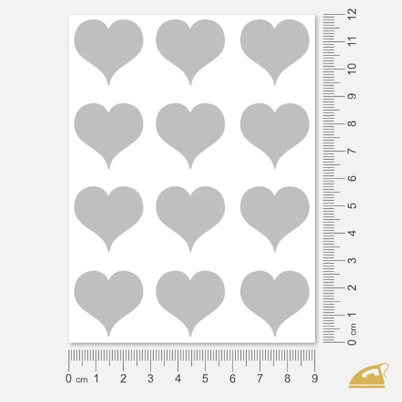 Reflexní nažehlovačky s jednoduchým motivem srdíček na archu 9×12 cm. Univerzální detail pro dětské i dospělé oblečení, zejména pro dívky a ženy.