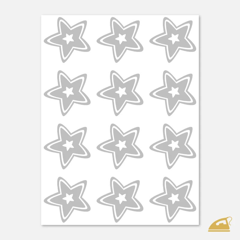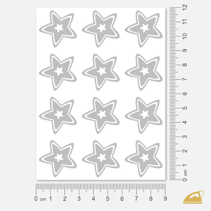 Aršík reflexních nažehlovaček s motivem hvězdy nabízí jednoduchý, ale výrazný dekorativní prvek na textil. Na archu o velikosti 9 × 12 cm se nachází 12 malých lemovaných hvězd, které lze na oblečení rozmístit samostatně nebo vytvořit souvislý vzor.