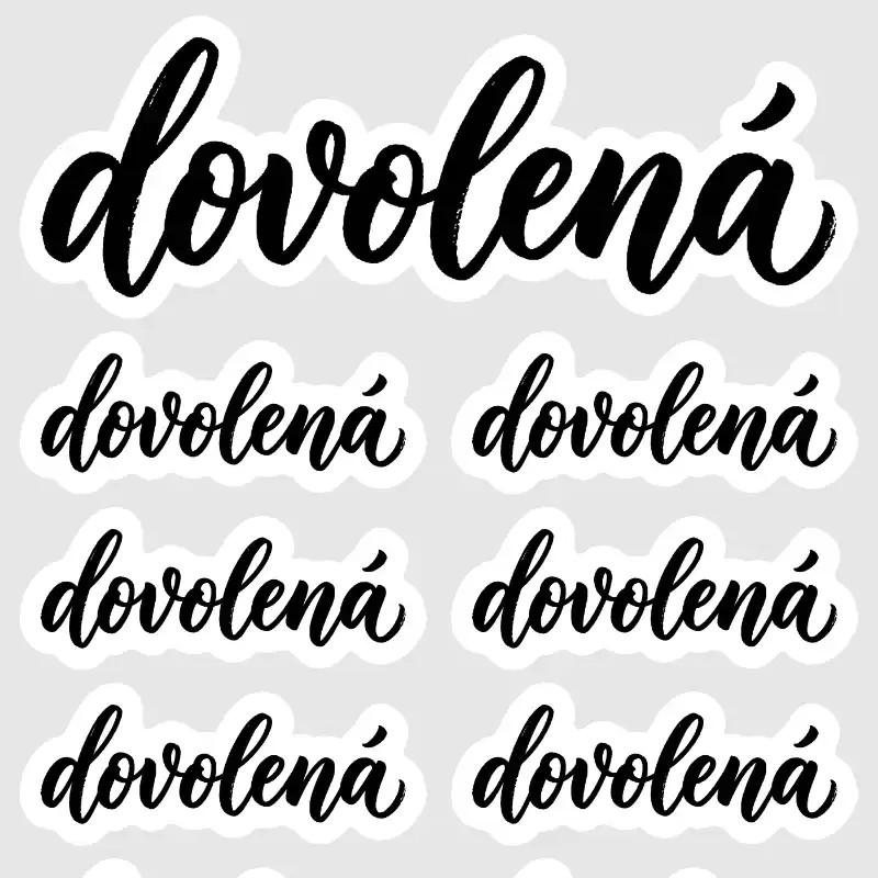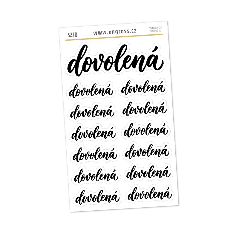 Aršík s 13 černobílými samolepkami s textem „dovolená“ v kaligrafickém fontu. Obsahuje jeden dominantní nápis ideální jako nadpis tematické stránky a 12 menších nálepek pro záznamy do týdenních či měsíčních přehledů. Perfektní pro bullet journal, cestovní deníky i scrapbooking.