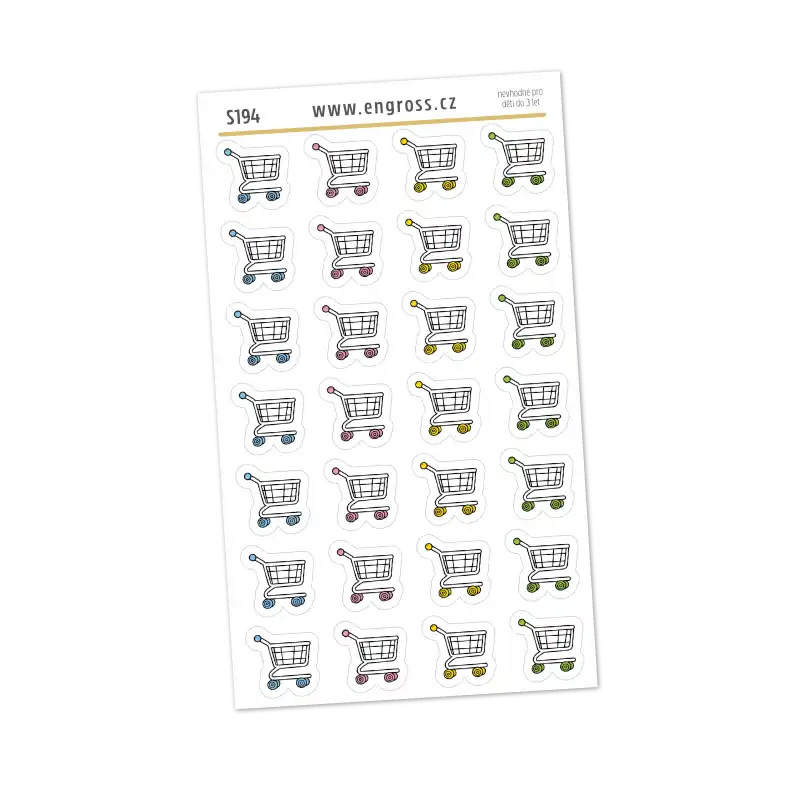 Na aršíku se nachází celkem 28 malých samolepek ve čtyřech barevných provedeních, takže je možné je snadno kombinovat podle typu nákupu nebo barevného ladění diáře. Díky své velikosti se samolepky vejdou i do těch nejmenších diářů, kapesních plannerů nebo hustě popsaných týdenních přehledů.