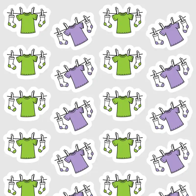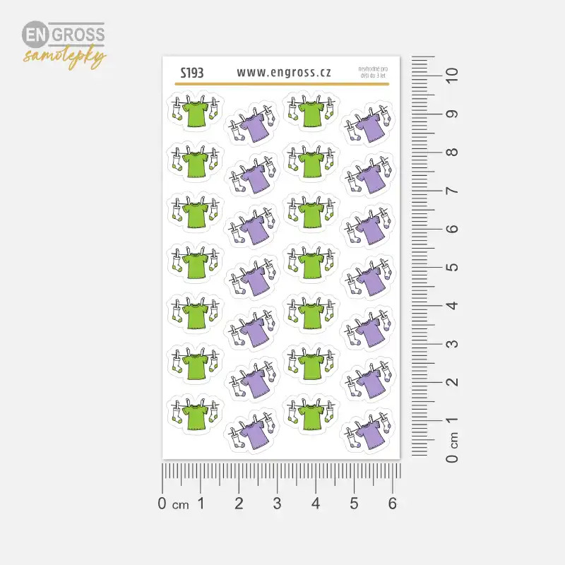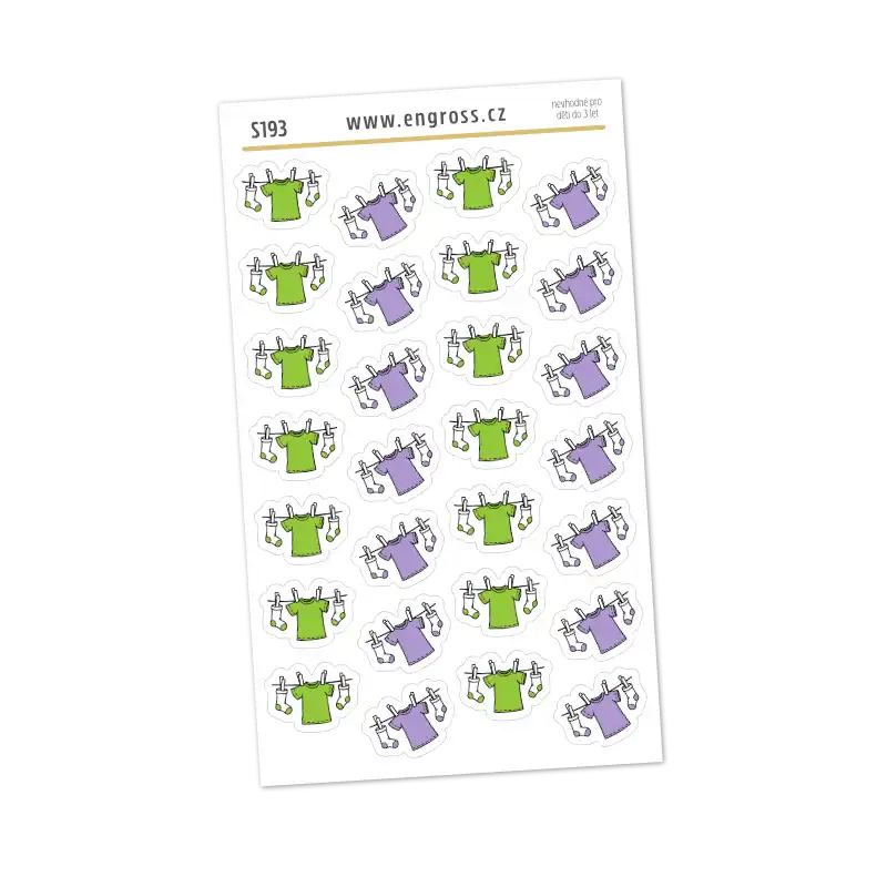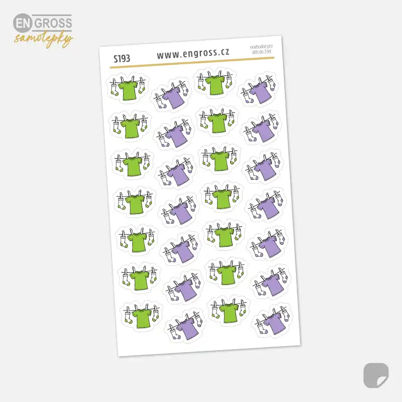 Malé samolepky z kolekce Tintimáci pro zaznamenání praní a sušení prádla v zelené a fialové barvě. Praktická pomůcka do každého diáře.