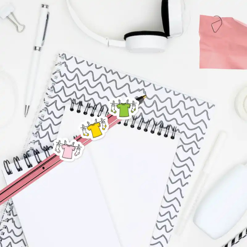 Samolepky do diáře Prádlo patří do autorské série Tintimáci, která je typická ručně kreslenými ilustracemi a drobným formátem vhodným i do velmi malých diářů. Motiv prádla na šňůře slouží jako jednoduchá a rychlá značka pro plánování praní nebo sušení.