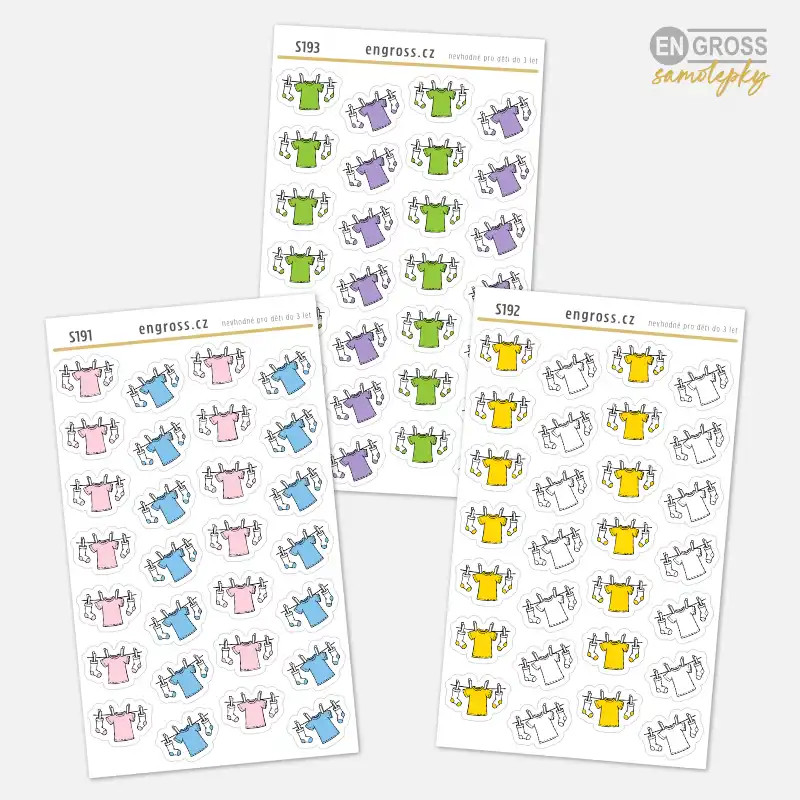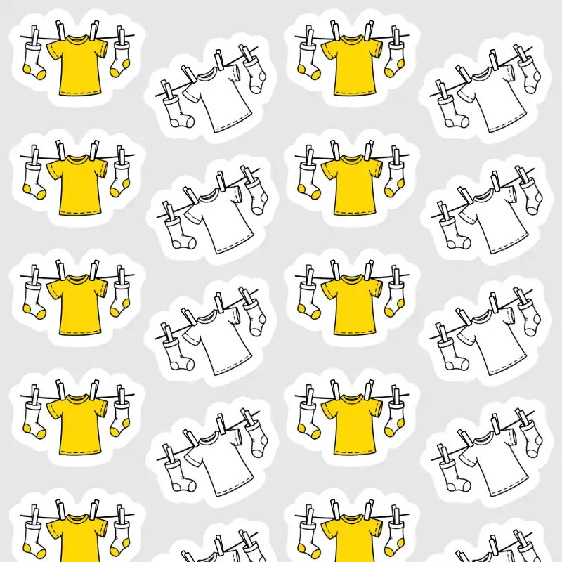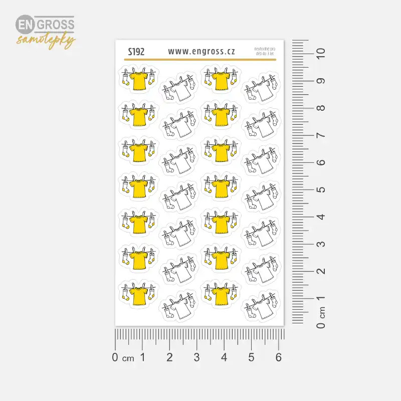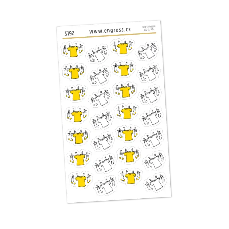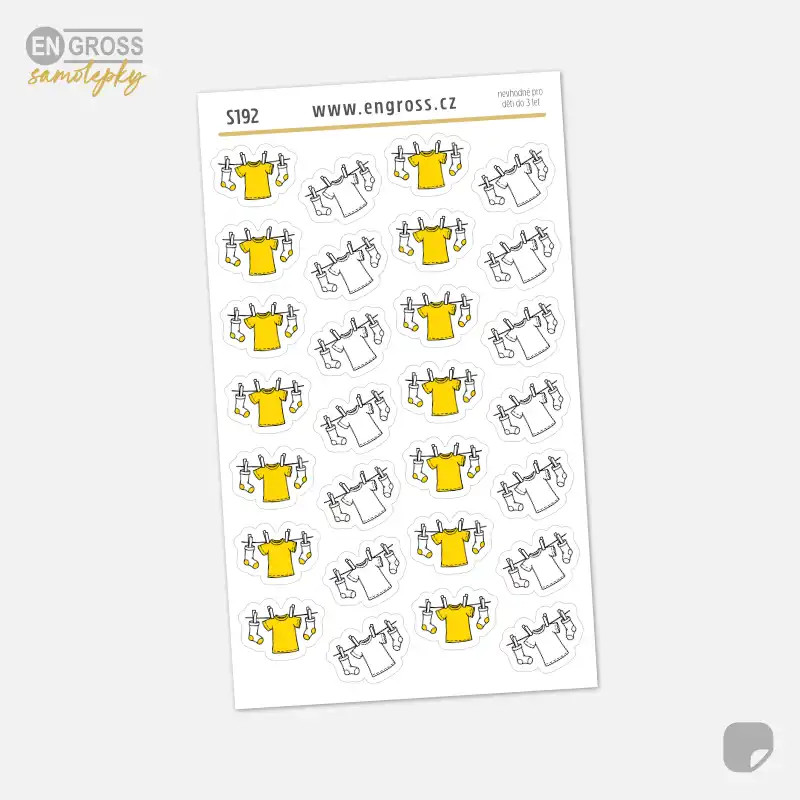 Malé kreslené samolepky s motivem prádla na šňůře ve žluté a černobílé variantě pro snadné plánování praní v diáři.