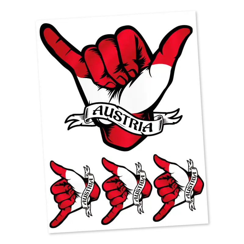 Shaka symbol v rakouských národních barvách s nápisem „Austria“ dodá každému kousku oblečení pořádnou dávku stylu a fanouškovské hrdosti.