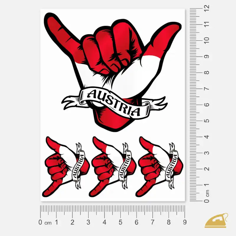 Nažehlovačka shaka ruky v rakouských barvách s nápisem Austria. Stylový doplněk na trička, mikiny i kšiltovky pro každého fanouška.