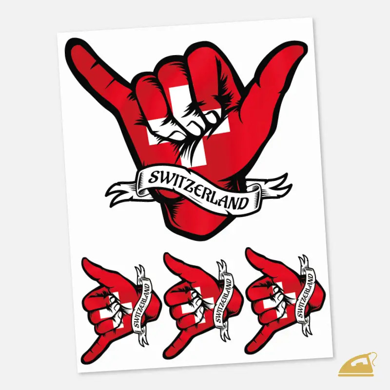 Když se potká švýcarská preciznost s uvolněným gestem shaka, vznikne nažehlovačka, která má styl! Aršík o velikosti 9 × 12 cm ukrývá jeden velký a tři malé motivy shaka ruky v červené a bílé s nápisem Switzerland.