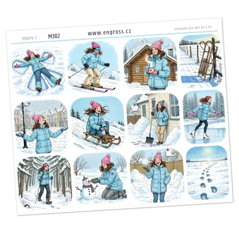Samolepkový aršík z kolekce Slečna zachycuje ženu, která si vychutnává zimu se vším, co k ní patří – sníh, pohyb, čerstvý vzduch a radost z maličkostí. Na archu se nachází 12 samolepek o výšce 3 cm s ilustracemi zimních aktivit.