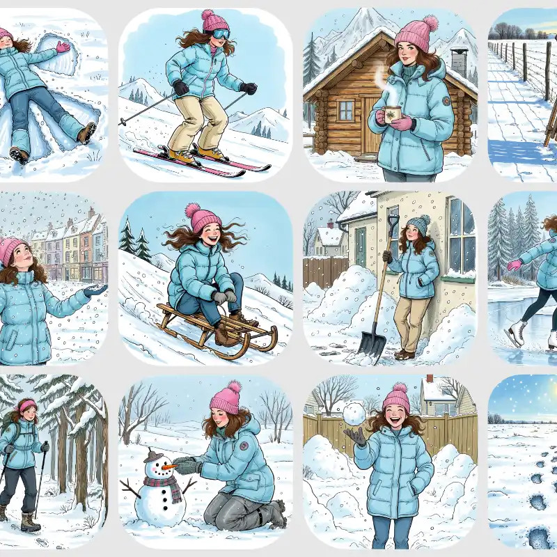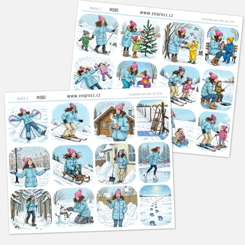 Motivy zahrnují lyžování, bruslení, sáňkování, zimní túru, odhrabávání sněhu, koulování i stavění sněhuláka. Každá samolepka připomíná, že zima nemusí být jen o chladu, ale i o energii, zábavě a chvílích strávených venku.