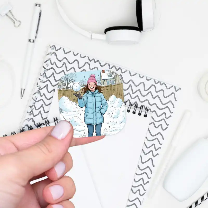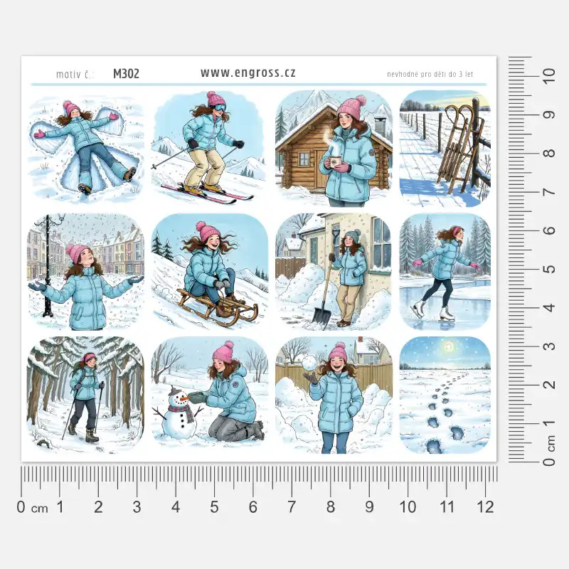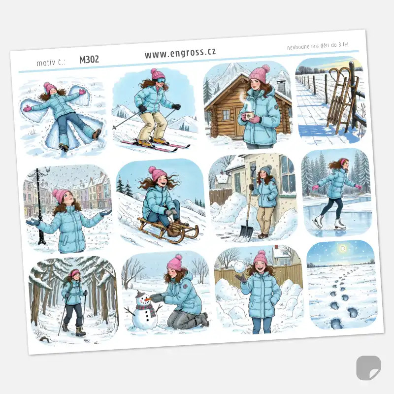 Zimní samolepky s motivem slečny, která si užívá sníh a pohyb. Ideální doplněk do diáře pro aktivní zimní dny.