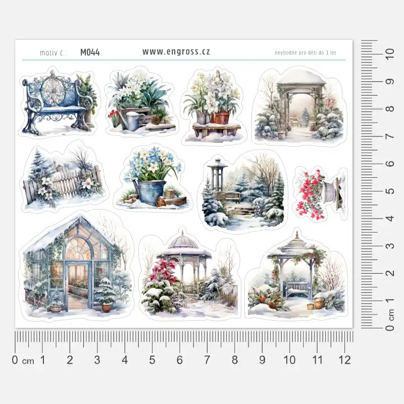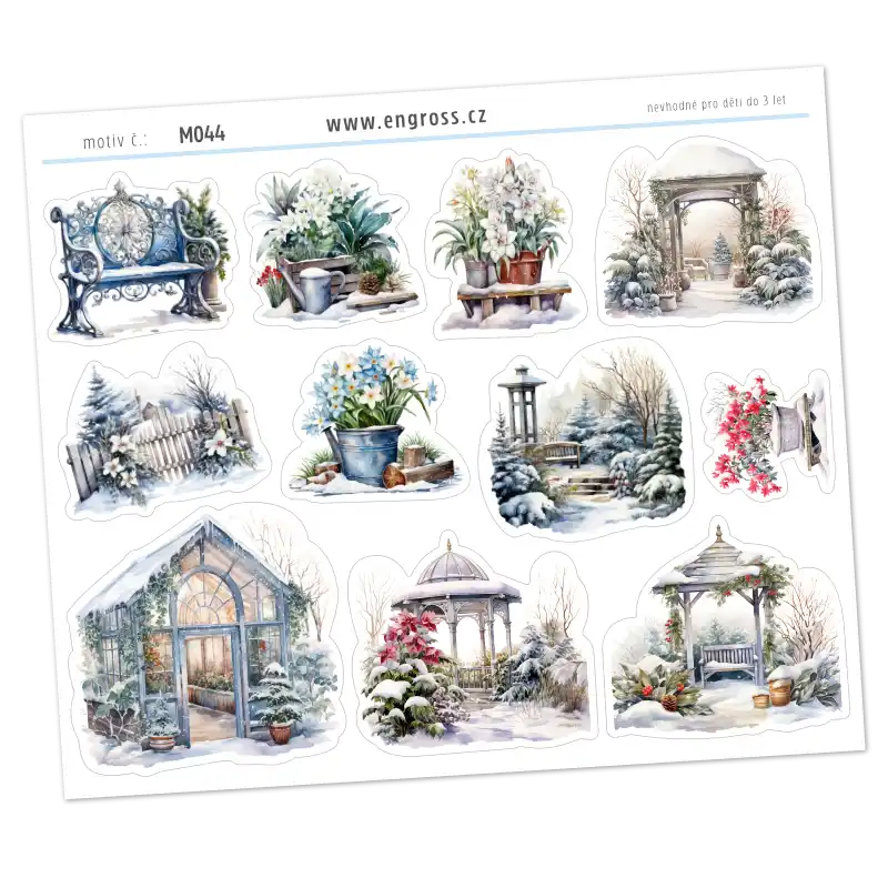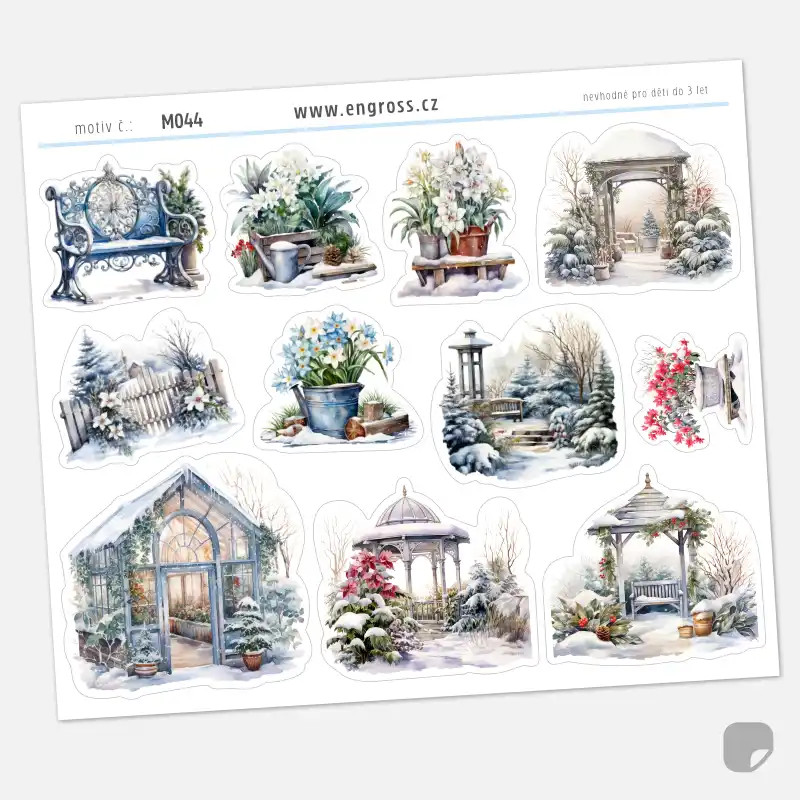 Samolepky do diáře – Zimní zahrada zachycují kouzlo tichého zimního období, kdy zahrada ještě odpočívá pod sněhem, ale už se objevují první náznaky jara. Watercolor ilustrace znázorňují zasněžený skleník, altány, lavičku i zahradní zátiší, ze kterých vykukují první květy.