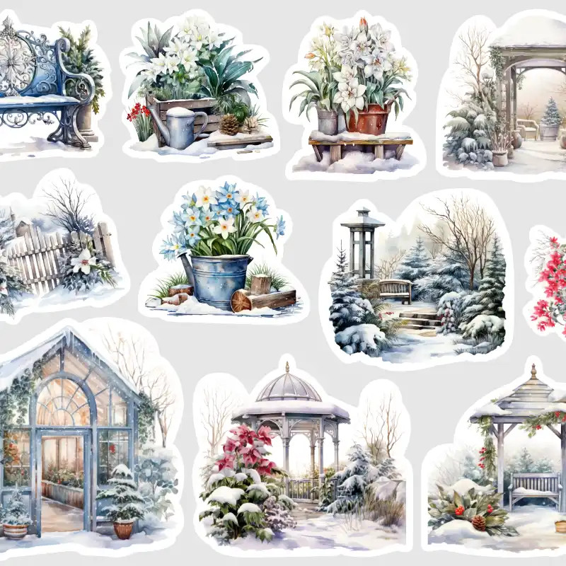 Watercolor samolepky zimní zahrady se sněhem a prvními květy. Něžná dekorace do diáře, deníku i kreativních projektů.