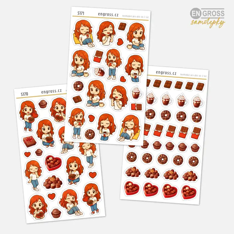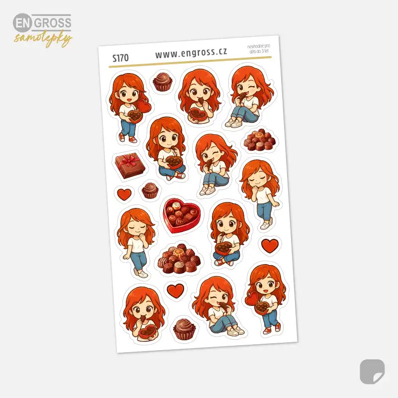 Mini samolepky s holčičkou - zrzkou, jak si vychutnává čokoládovou bonboniérou jsou tu právě pro tyto chvíle. Díky drobné velikosti se nálepky vejdou do každého políčka diáře, bullet journalu nebo deníku. Aršík je naplněný k prasknutí, takže se z každého sladkého momentu může stát krásně zdokumentovaná vzpomínka.