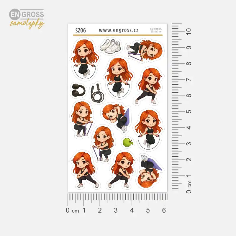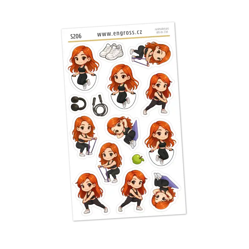 Dostaňte se do formy s úsměvem a barvami! Naše mini samolepky s motivem zrzky jsou navrženy pro všechny ženy, které milují pohyb a přehledné plánování. Aršík obsahuje detailní ilustrace postavičky při skákání přes švihadlo, protahování (strečinku), posilování břicha i efektivním cvičení s odporovou gumou.