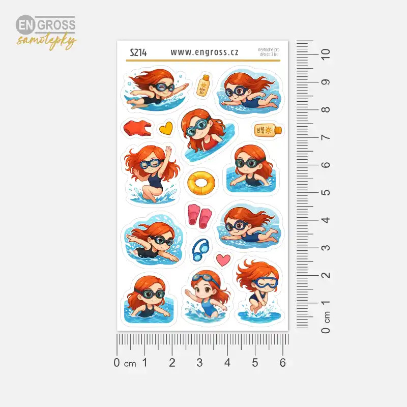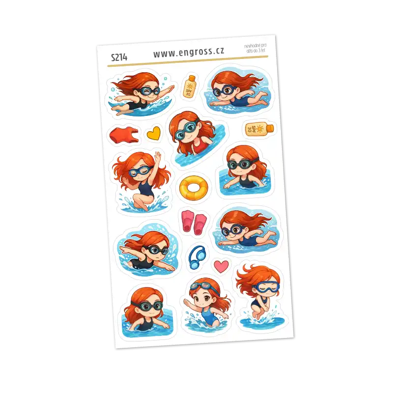 Aktivní postavičky: 10 samolepek zrzky zachycené v různých plaveckých stylech, při skoku do vody i relaxaci na hladině.
