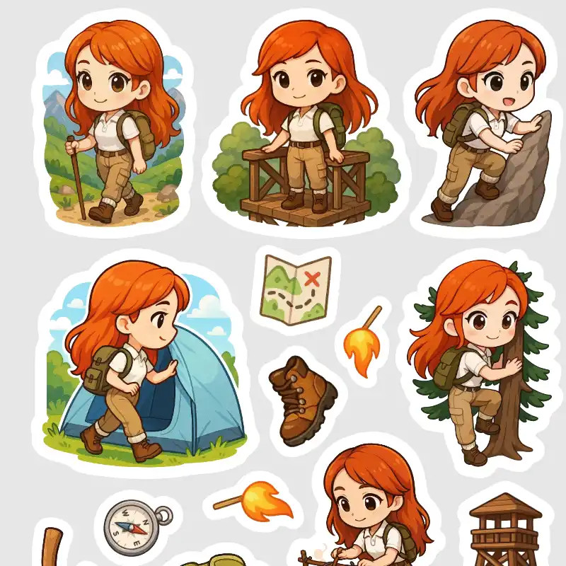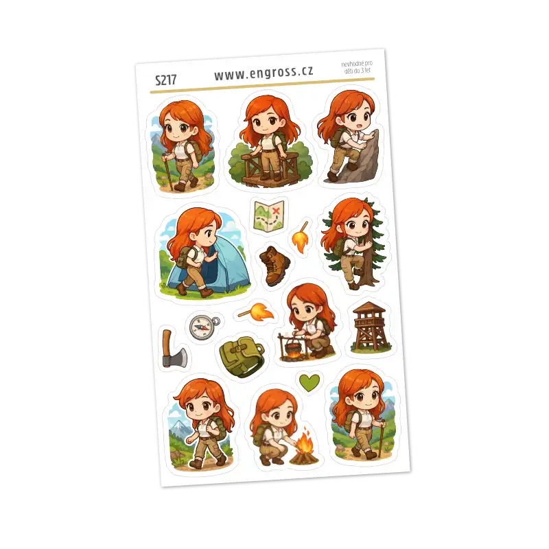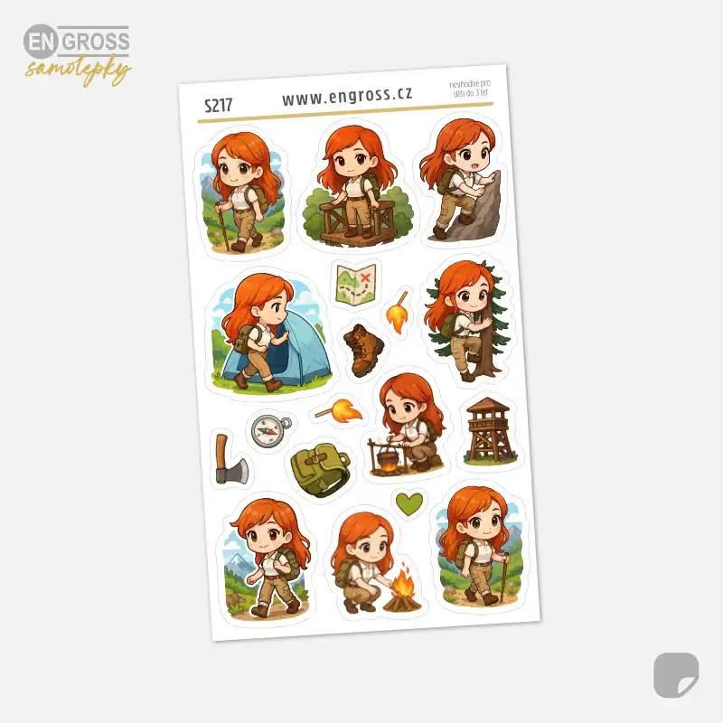 Aktivní postavičky: 9 samolepek zrzky v akci – při chůzi s turistickou holí, lezení po skalách, sledování okolí z vyhlídky, stavění stanu nebo opékání u ohně.