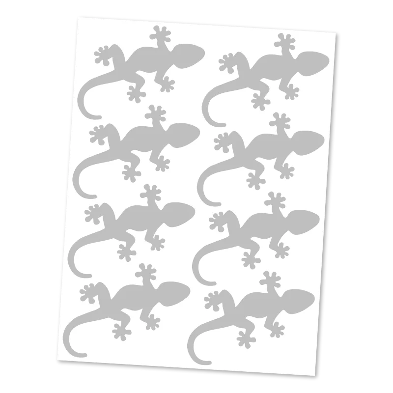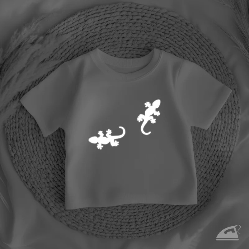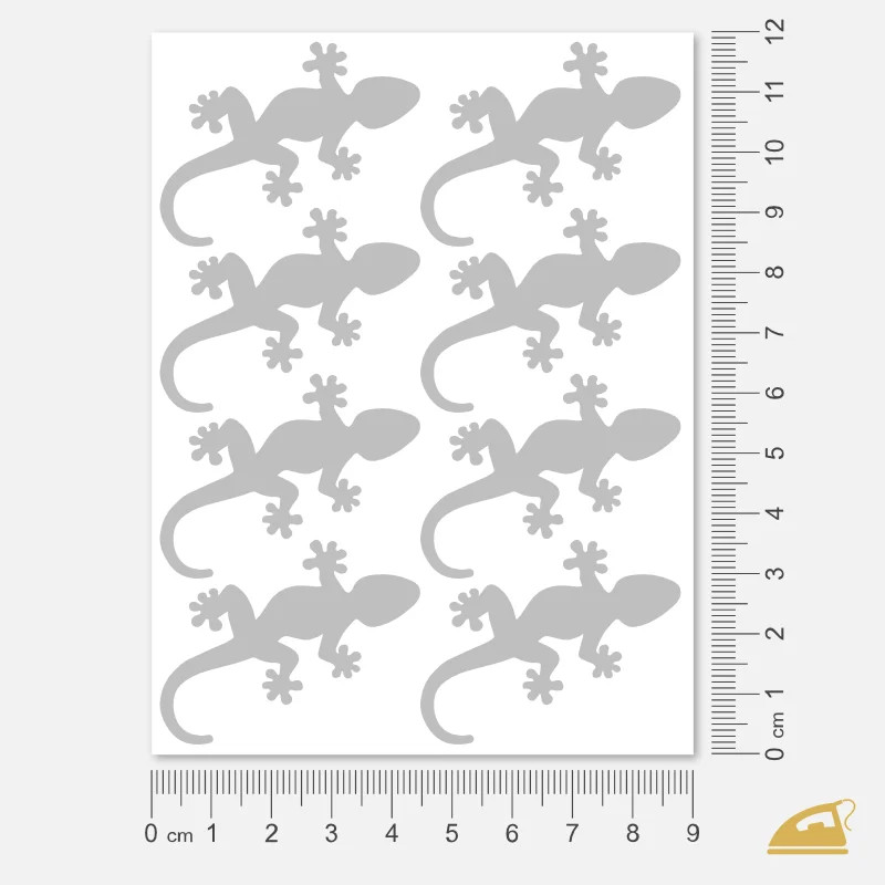 Reflexní nažehlovačky Ještěrka malá nabízejí oblíbený motiv, který decentně oživí oblečení a zároveň přispívá k lepší viditelnosti za šera a tmy. Na archu o velikosti 9 × 12 cm se nachází osm malých siluet ještěrek.