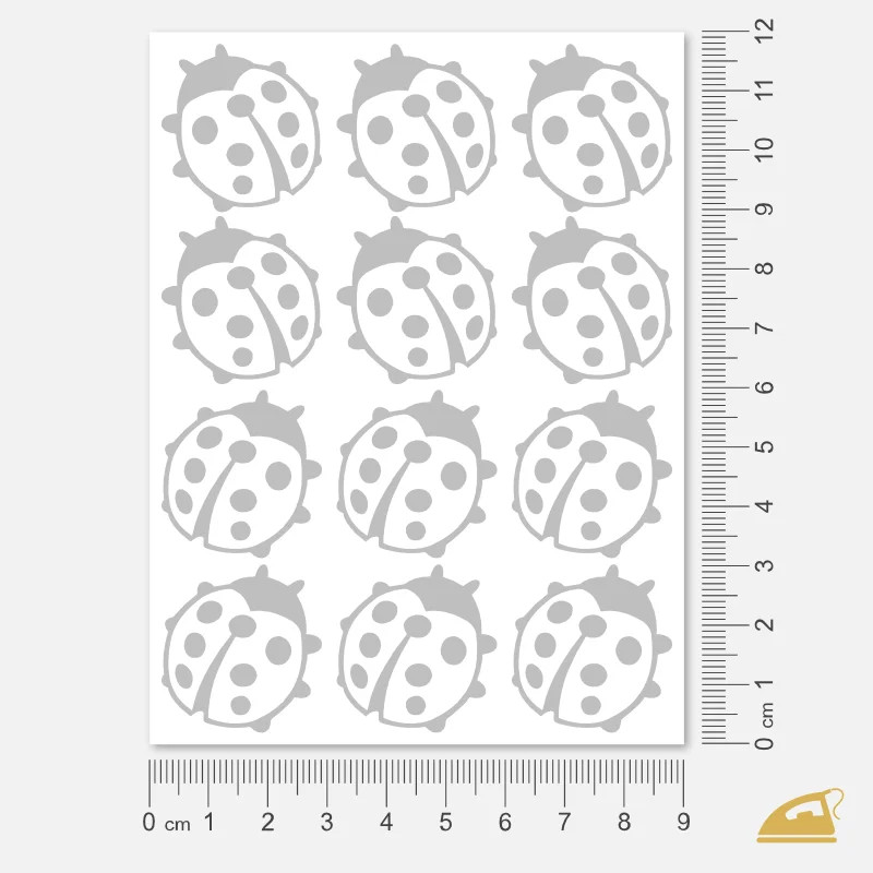 Reflexní nažehlovačky s malými beruškami na archu 9×12 cm. Jemný motiv s vysokou odrazivostí pro dětské oblečení, ideální pro děvčata.
