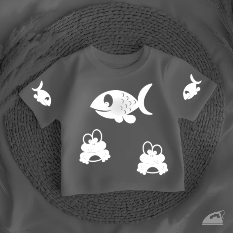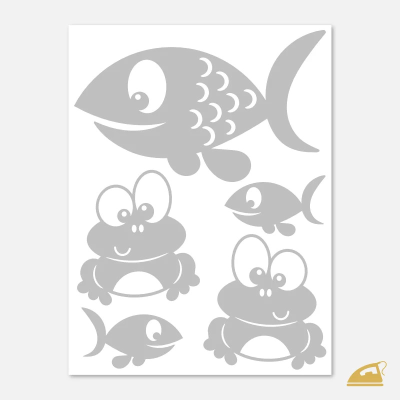 Reflexní nažehlovačky s motivy žab a rybiček na archu 9×12 cm. Hravé obrázky z prostředí rybníka, které lze na oblečení libovolně kombinovat.