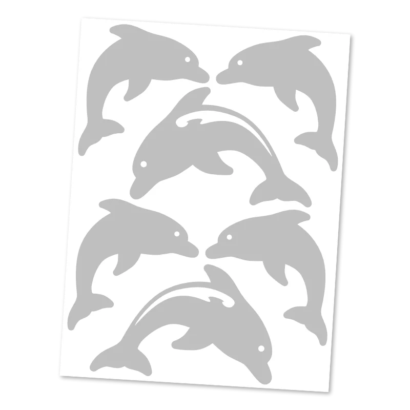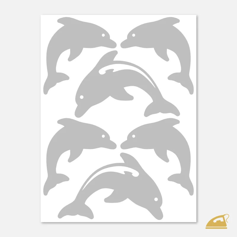 Naše reflexní nažehlovačky s delfíny zachycují tato úžasná zvířata v jejich nejpřirozenějším pohybu – ve skoku. Na archu 9x12 cm najdete celkem 6 delfínů, kteří jsou rozděleni do dvou velikostí a dvou designových provedení (plné siluety a siluety s efektní linkou).